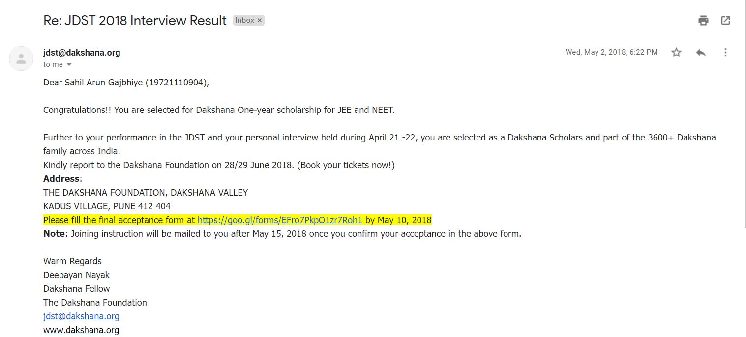 - Selected for Dakshana Foundation.